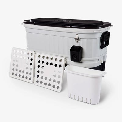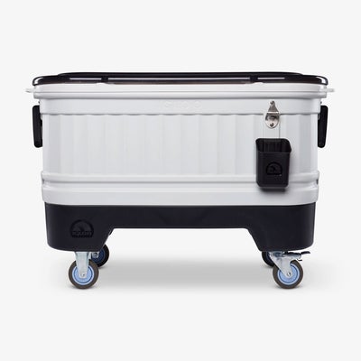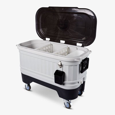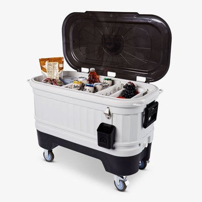 Ultratherm™ insulated body for long-lasting ice retention Elevated base for easier reaching into cooler Heavy-duty locking casters for ready-to-roll transportability Removable drink dividers and separate bottle/wine caddy to keep your