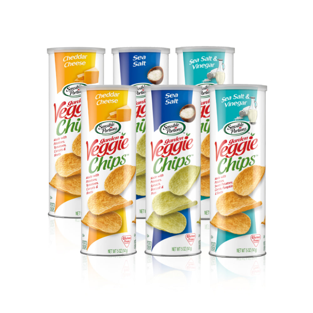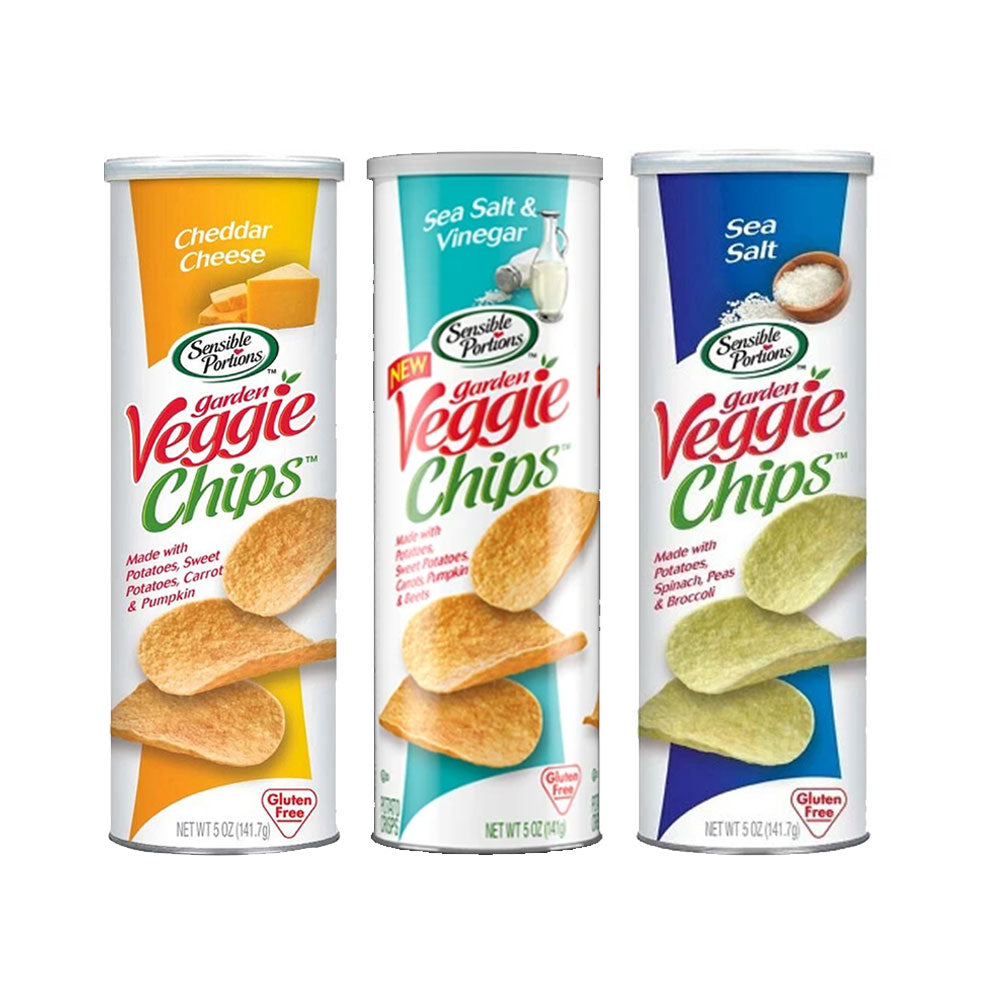 سانسيبل بورشنزعلبة رقائق البطاطس بجبنة الشيدر 141 غ علبة رقائق بطاطس بالملح والخل 141 غ علبة رقائق بطاطس بملح البحر 141 غ مصنوعة من البطاطس والخضروات المزروعة في الحديقة. 30٪