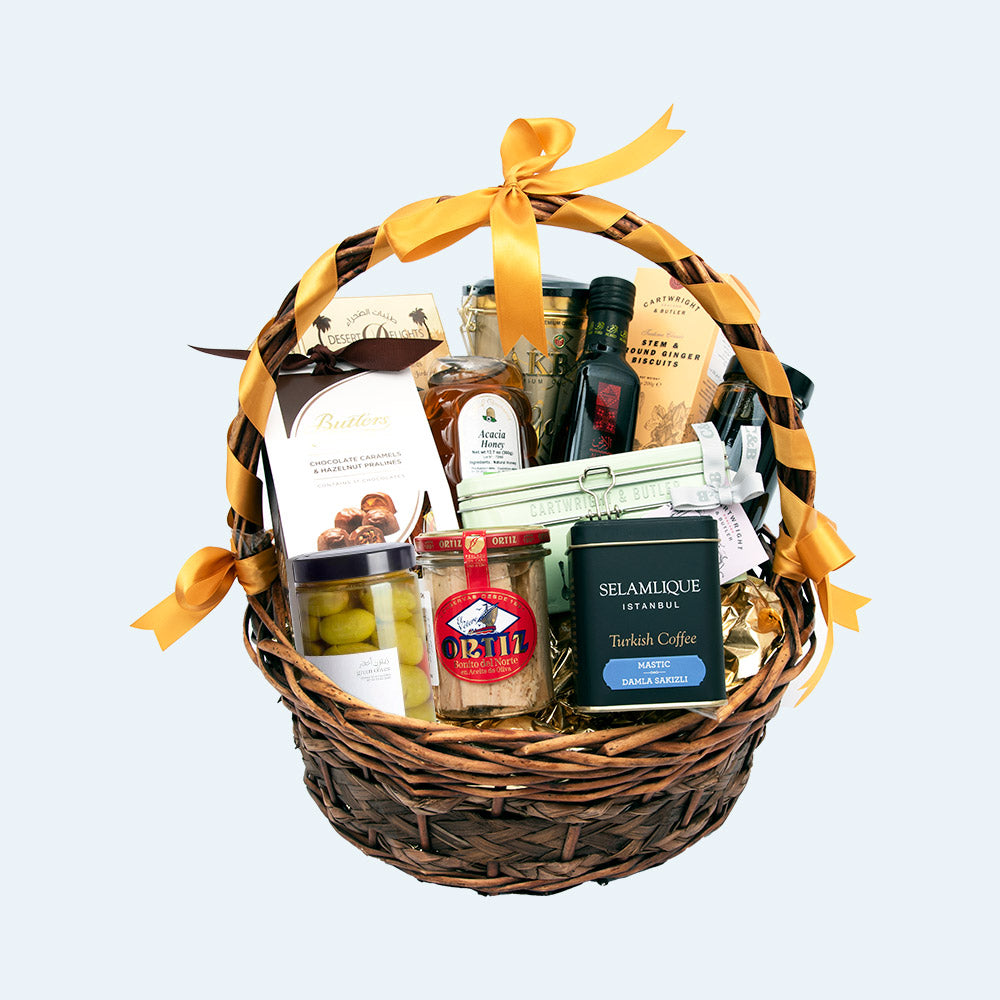 تحتوي سلة هدايا رمضان: 1 AL ARD زيت الزيتون البكر 250 مل 1 كاما ديباسيس 365G 1 كاما الخضراء الزيتون 610G 1 Ortiz تونة أبيض في جرة زيت الزيتون 220