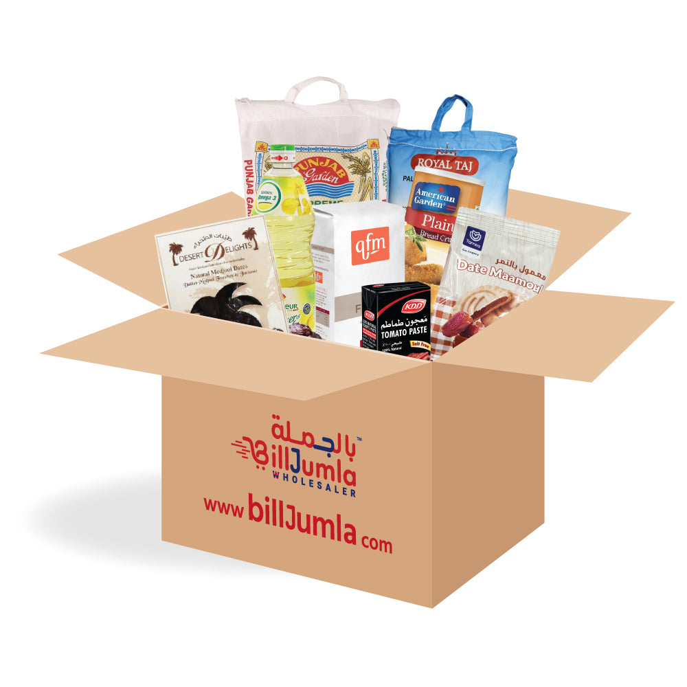 تحتوي باقة Billjumla الرمضانية الخاصة على: 1 ديزرت ديلايتس تمر المجهول 1 أرز كوهينور بسمتي 4.5 كجم 1 زيت دوار الشمس ليسيور 2 لتر 1 أمريكان جاردن - فتات خبز