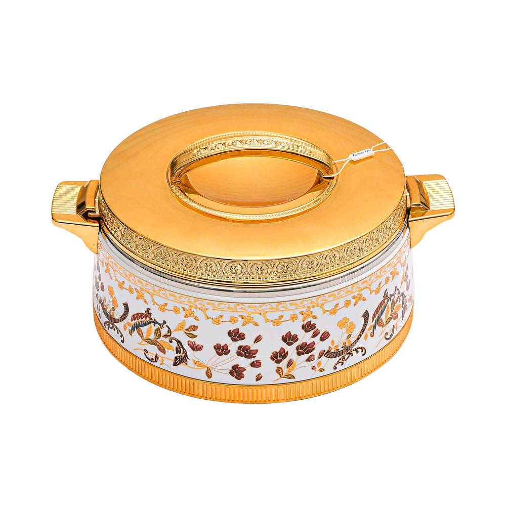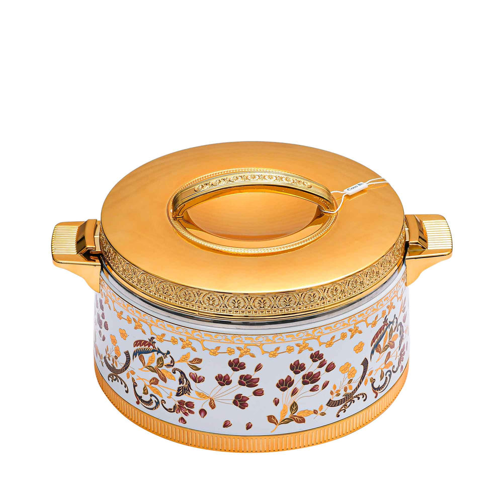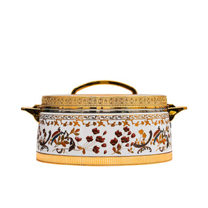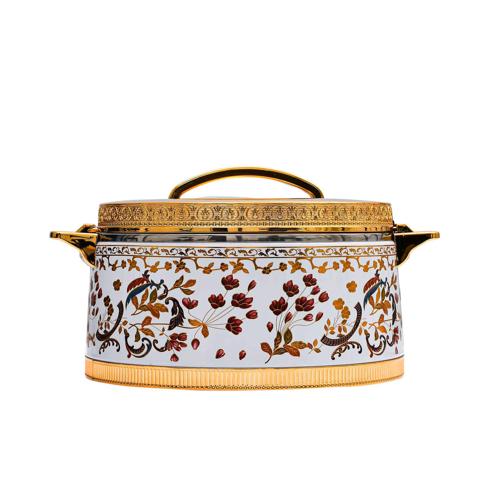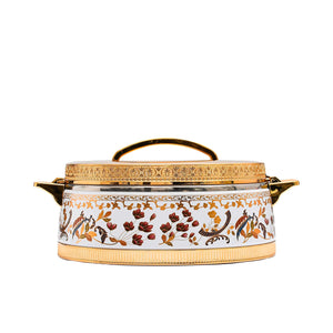 Add a touch of elegance to your dining experience with this beautifully designed insulated food warmer from Casa Blu. The white body is adorned with a detailed pattern featuring stylized flowers, leaves, and birds in shades of red, orange, and gold. This creates a visually appealing piece perfect for keeping your dishes warm at gatherings, parties, or everyday meals. The durable metal construction (likely stainless steel) and insulated interior help maintain food temperature. The secure lid and convenient side handles ensure easy serving and transport.