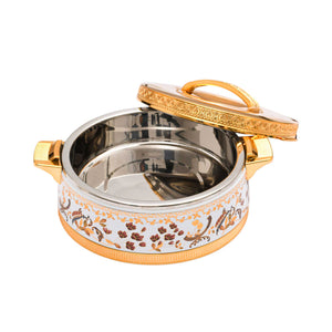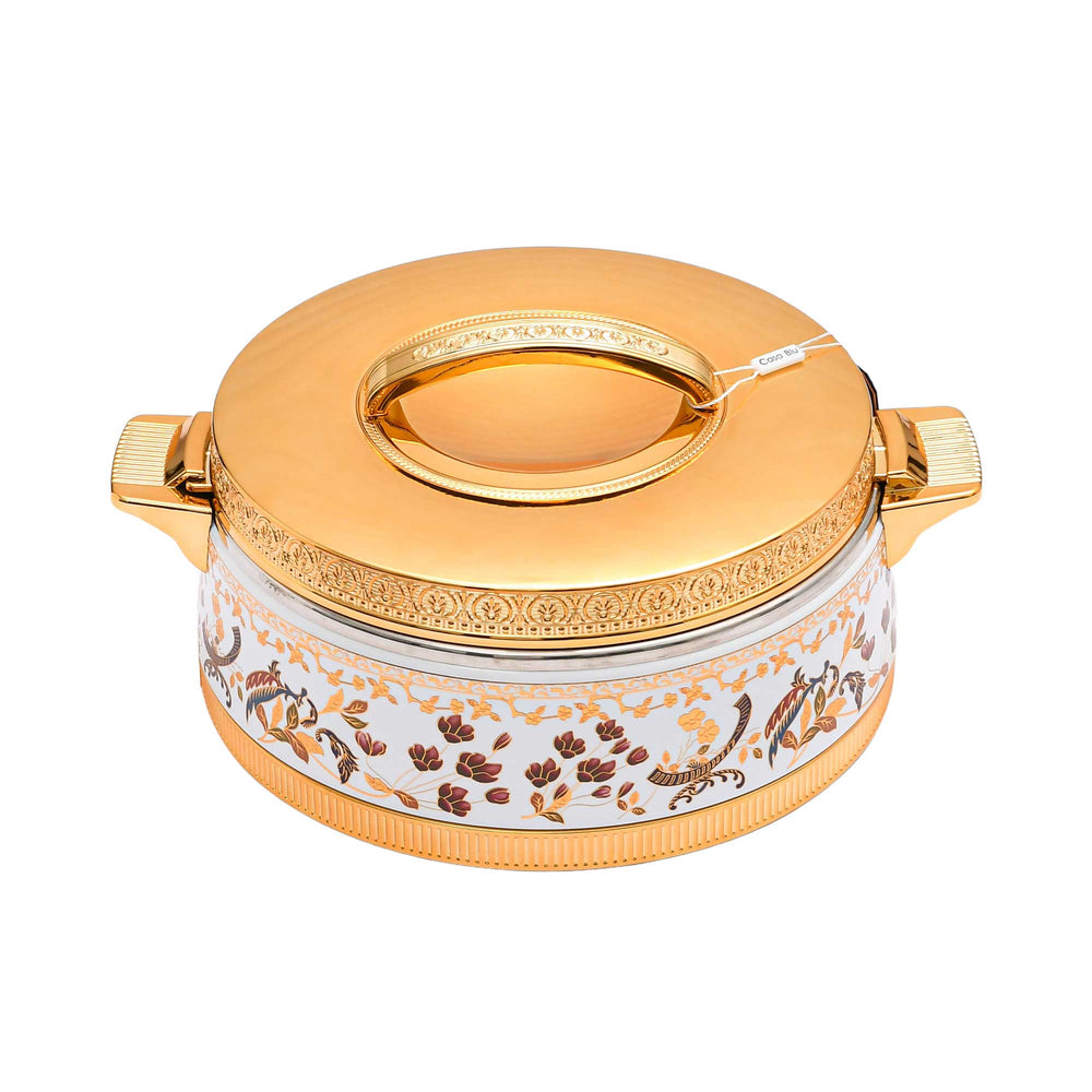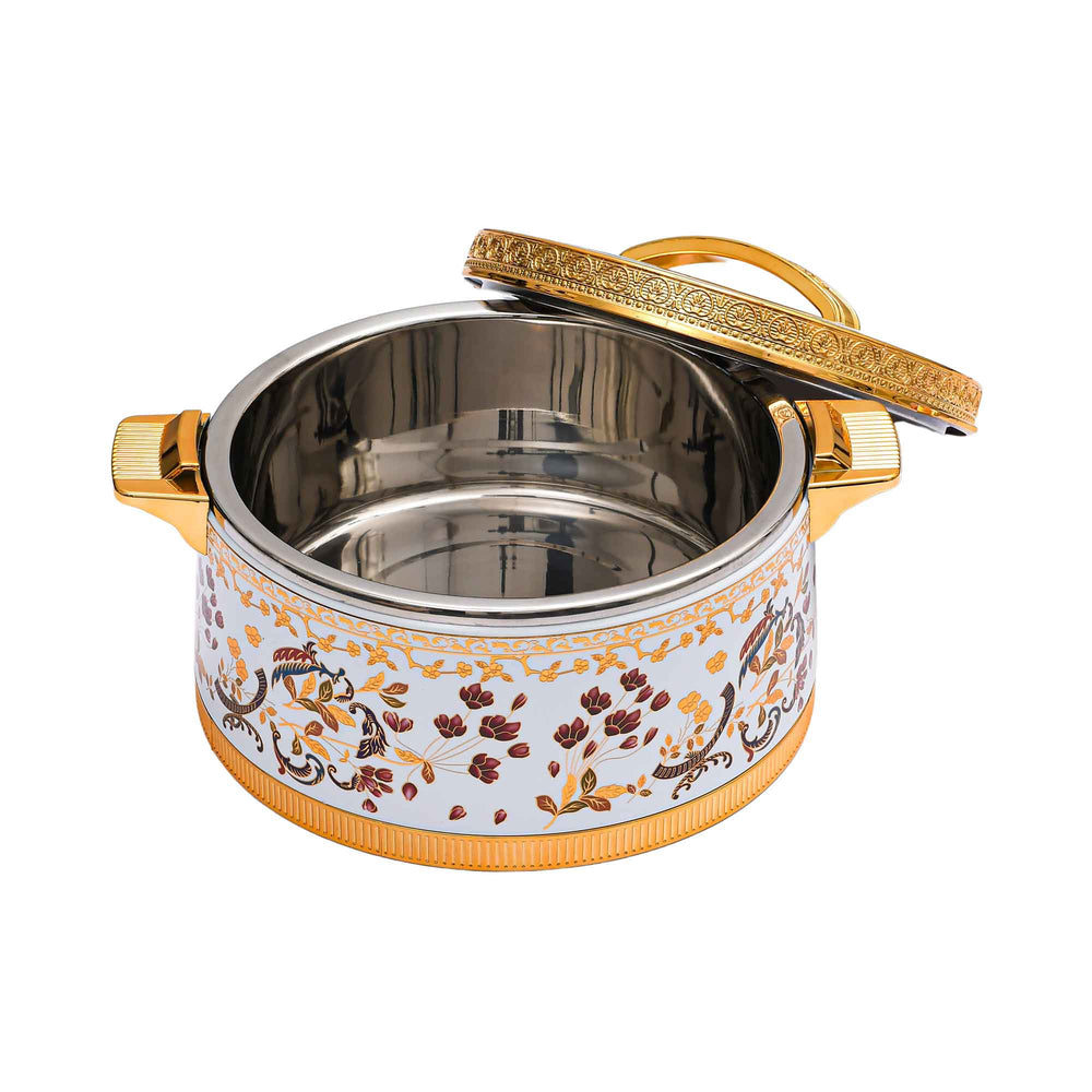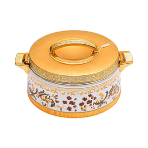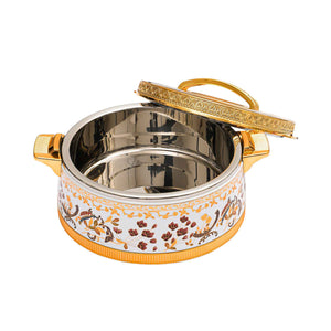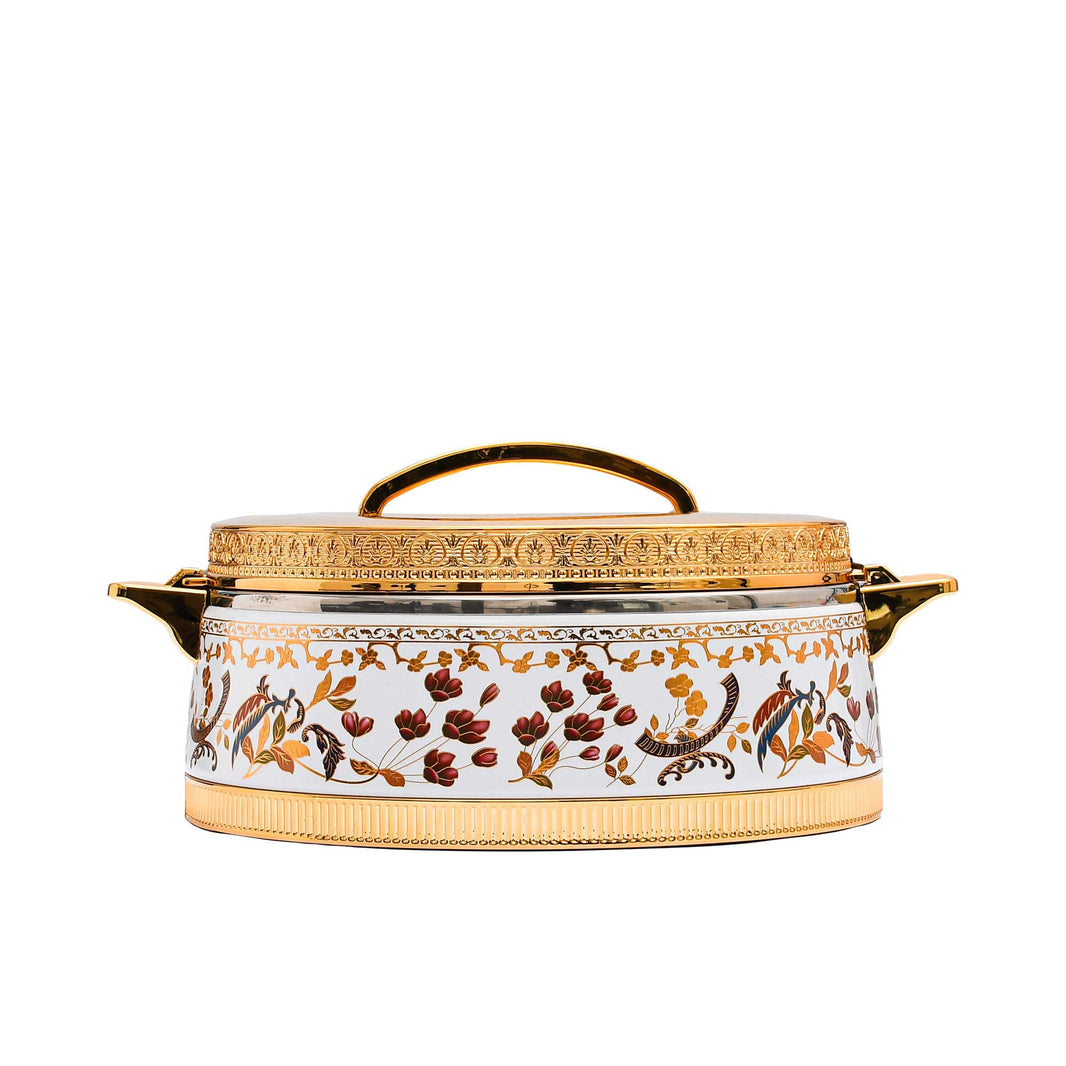 Add a touch of elegance to your dining experience with this beautifully designed insulated food warmer from Casa Blu. The white body is adorned with a detailed pattern featuring stylized flowers, leaves, and birds in shades of red, orange, and gold. This creates a visually appealing piece perfect for keeping your dishes warm at gatherings, parties, or everyday meals. The durable metal construction (likely stainless steel) and insulated interior help maintain food temperature. The secure lid and convenient side handles ensure easy serving and transport.