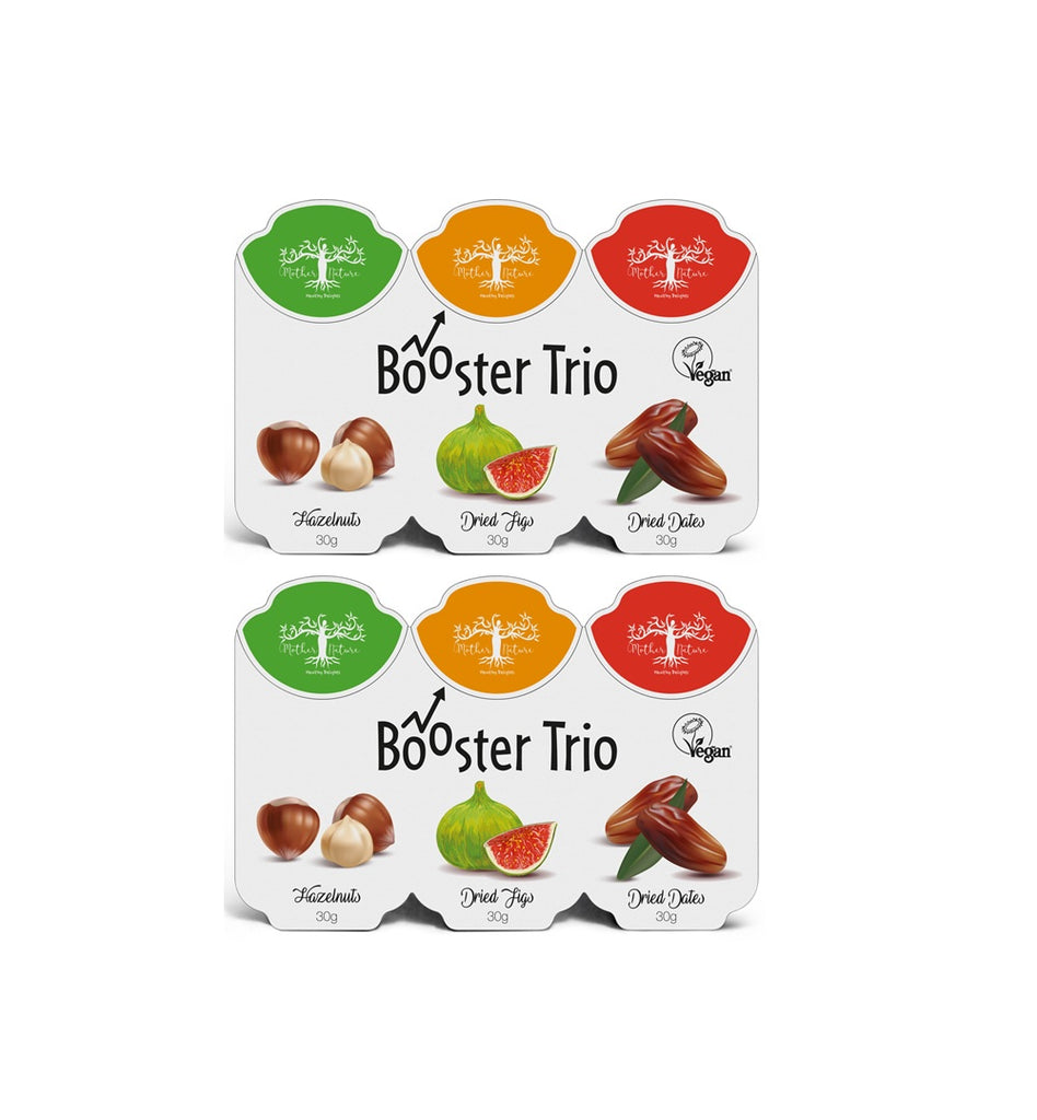 Booster Trio عبارة عن مزيج لذيذ من البندق والتين المجفف والتمور المجففة.
