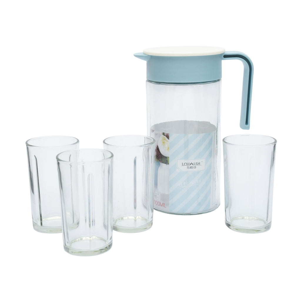 إبريق زجاجي أزرق ملكي سعة 1000 مل مع طقم 4 قطع أكواب سعة 200 مل