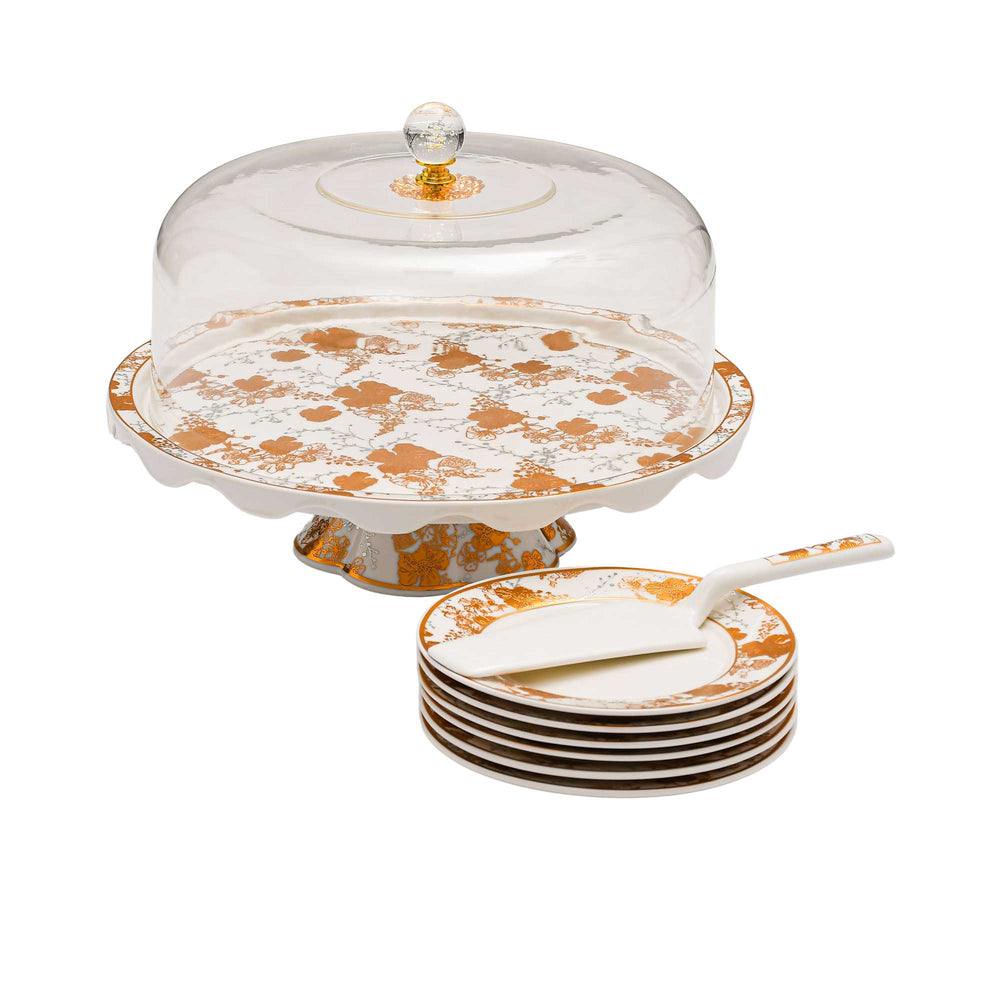 Casa Blu Abstract Art Cake Stand with Dome and Serving Plates (8pc Set)-Gold Accents