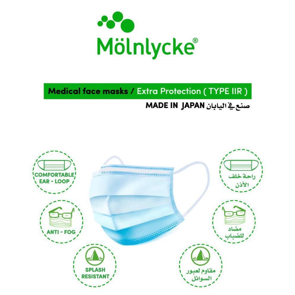Molnlycke Medical Face Mask are class 1 medical masks, and can be used for healthcare use. Non-Woven Fiber Fabric. Anti Fog. Fine Ear loop & Filtration. Maximum Breath-ability. Comfortable to
