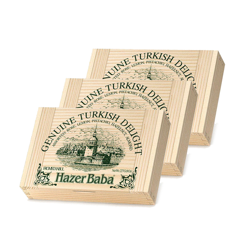 Hazerbaba Turkish Delights Rose Lemon Pistacho Almond Hazelnut Wooden 227g - (Pack Of 3)
