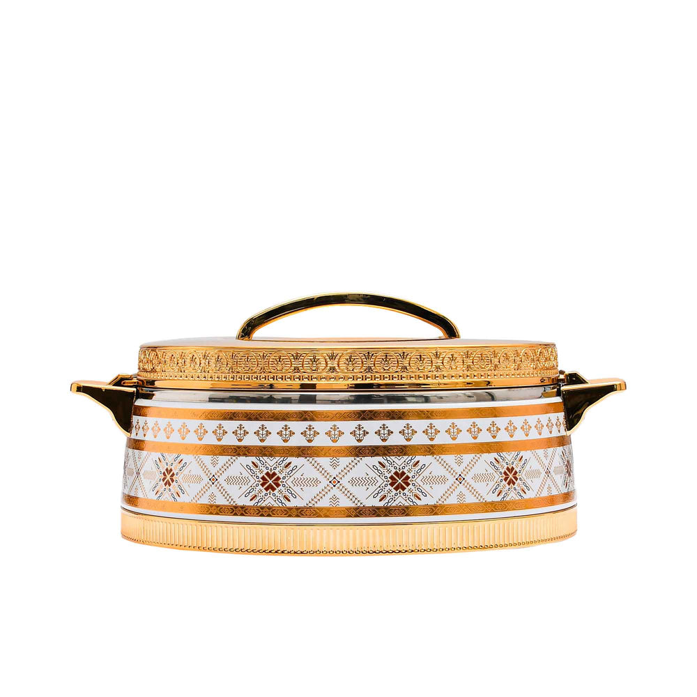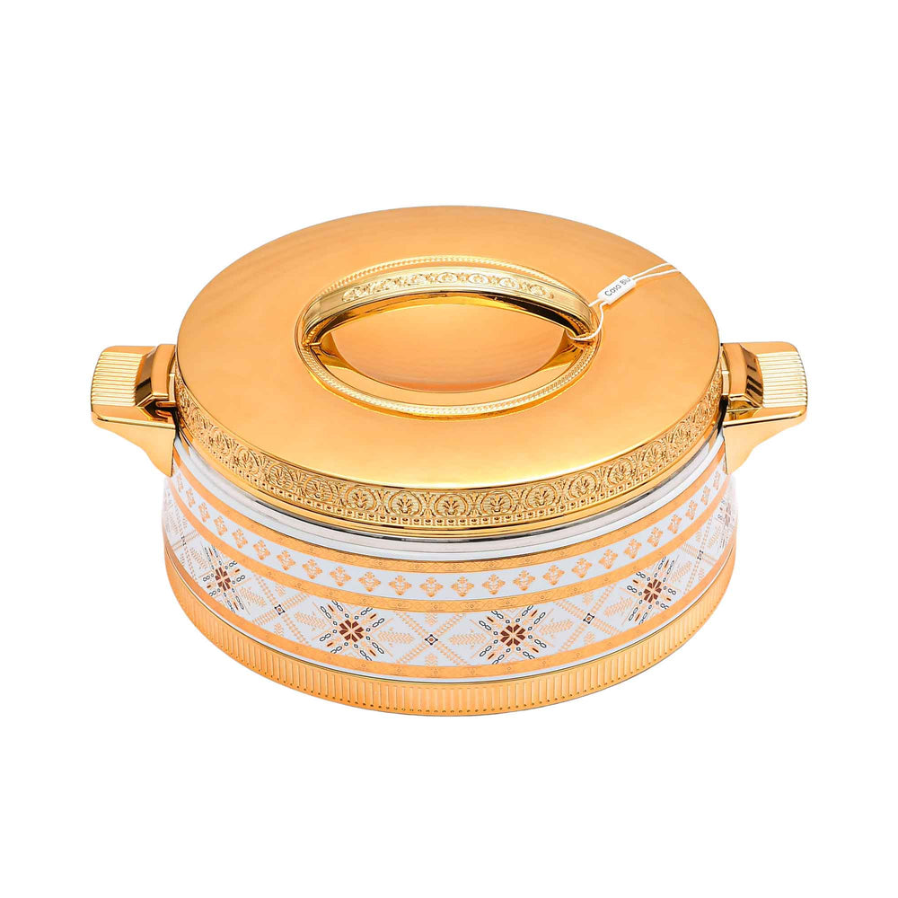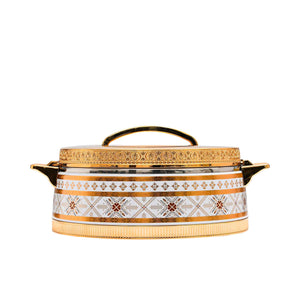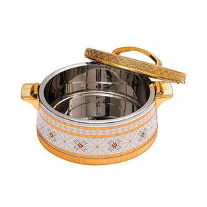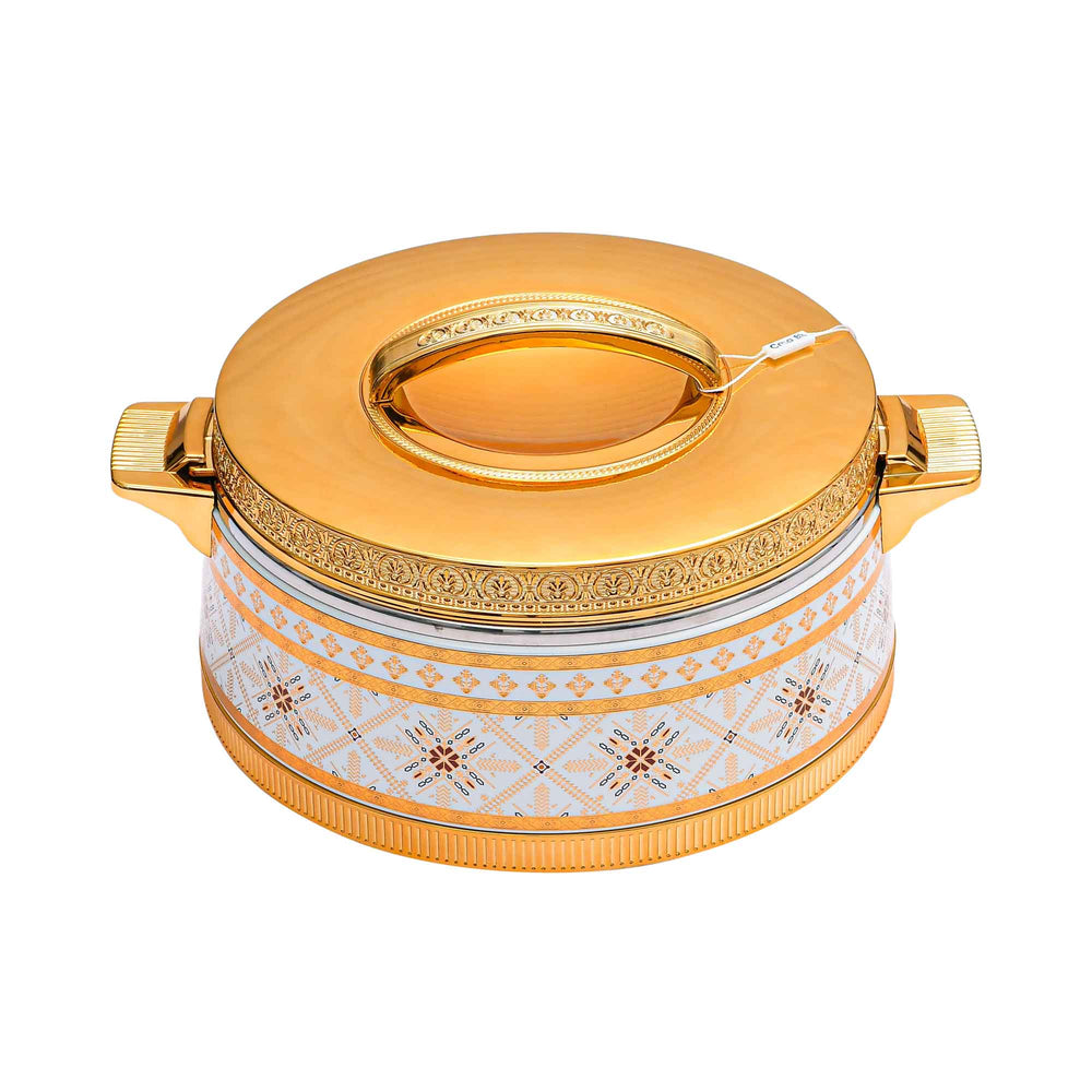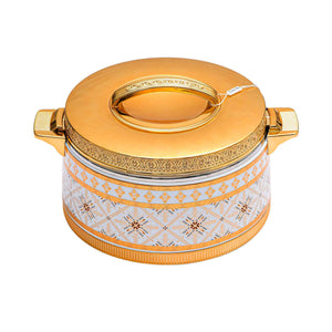 This Casa Blu insulated food warmer combines functionality and elegant design, making it a perfect addition to any dining table. The white body features a distinctive geometric diamond pattern in gold and subtle reddish-brown accents, creating a visually appealing piece. The durable metal construction (stainless steel) and insulated interior ensure that your food stays warm for extended periods. The secure-fitting lid and convenient side handles make serving and transporting your dishes easy and convenient.