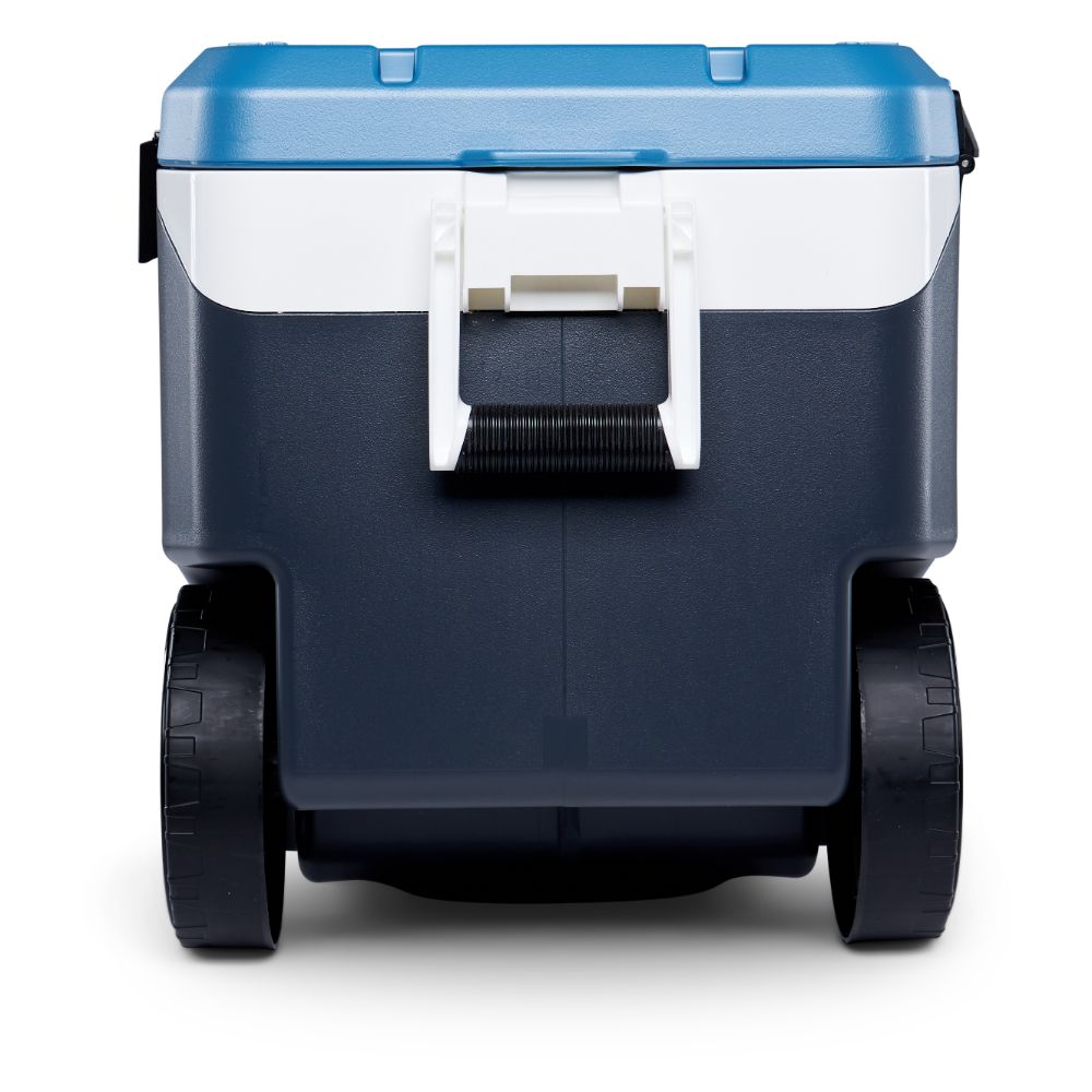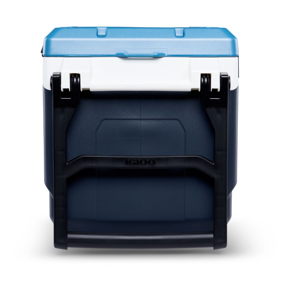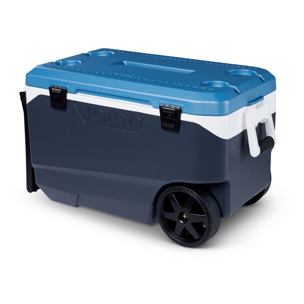 The Igloo® Latitude 90 Quart Rolling Cooler is extremely durable and has all-terrain wheels for easy travel. The flip and tow handle reduces your towing force by up to 50%. The Latitude 90 Quart Cooler can hold up to 137 cans and has 4 self-draining beverage holders located on the lid. With a media slot, you can secure your mobile device right on top of the cooler.