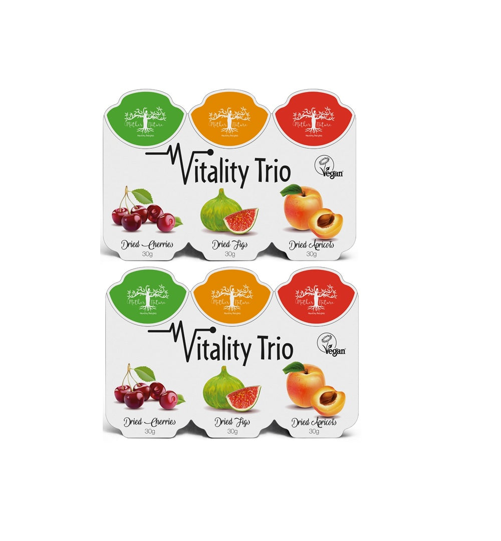 Snack 100% NATURAL anytime and anywhere! Vitality Trio is a Yummy mix of dried cherries, dried figs and dried apricots. Perfect for sharing in the office or for those that like