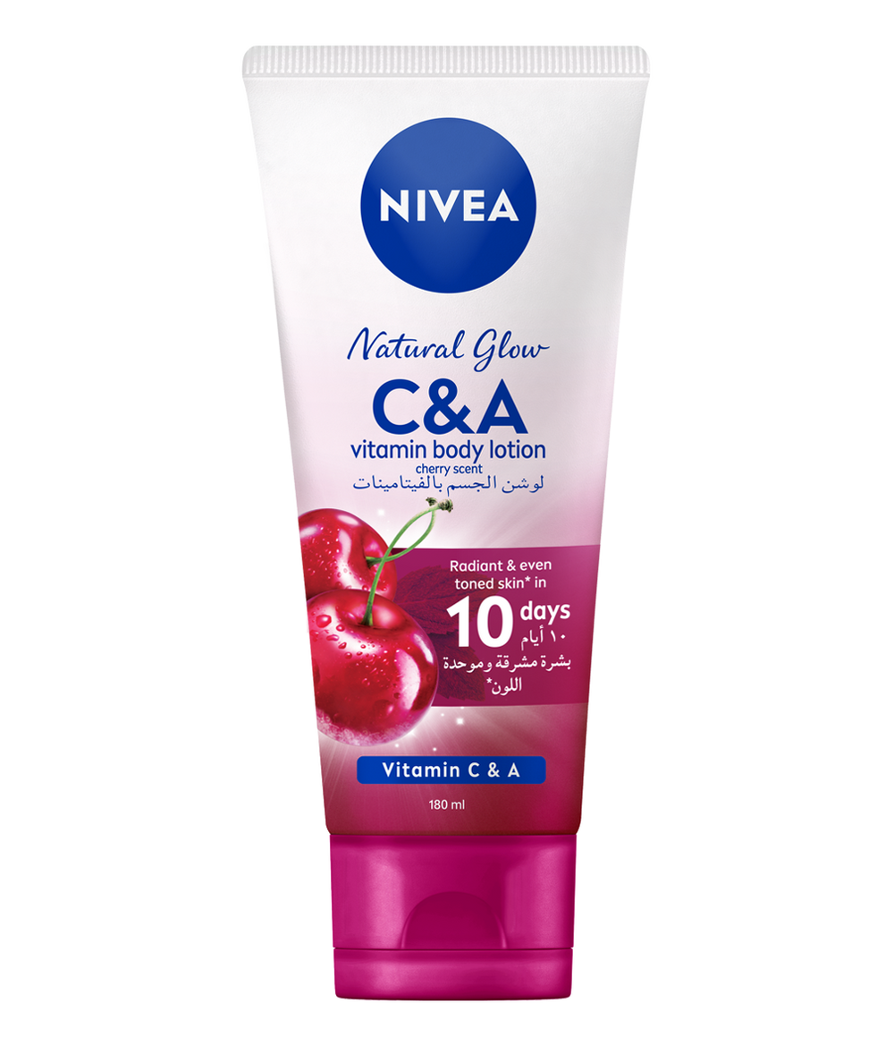 NIVEA NATURAL GLOW C&A VITAMIN BODY LOTION FOR RADIANT AND EVEN SKIN TONE Light texture, fast absorbing vitamin lotion. *Helps improve the appearance of evennes of skin tone in 10 days. For radiant and even skin tone.