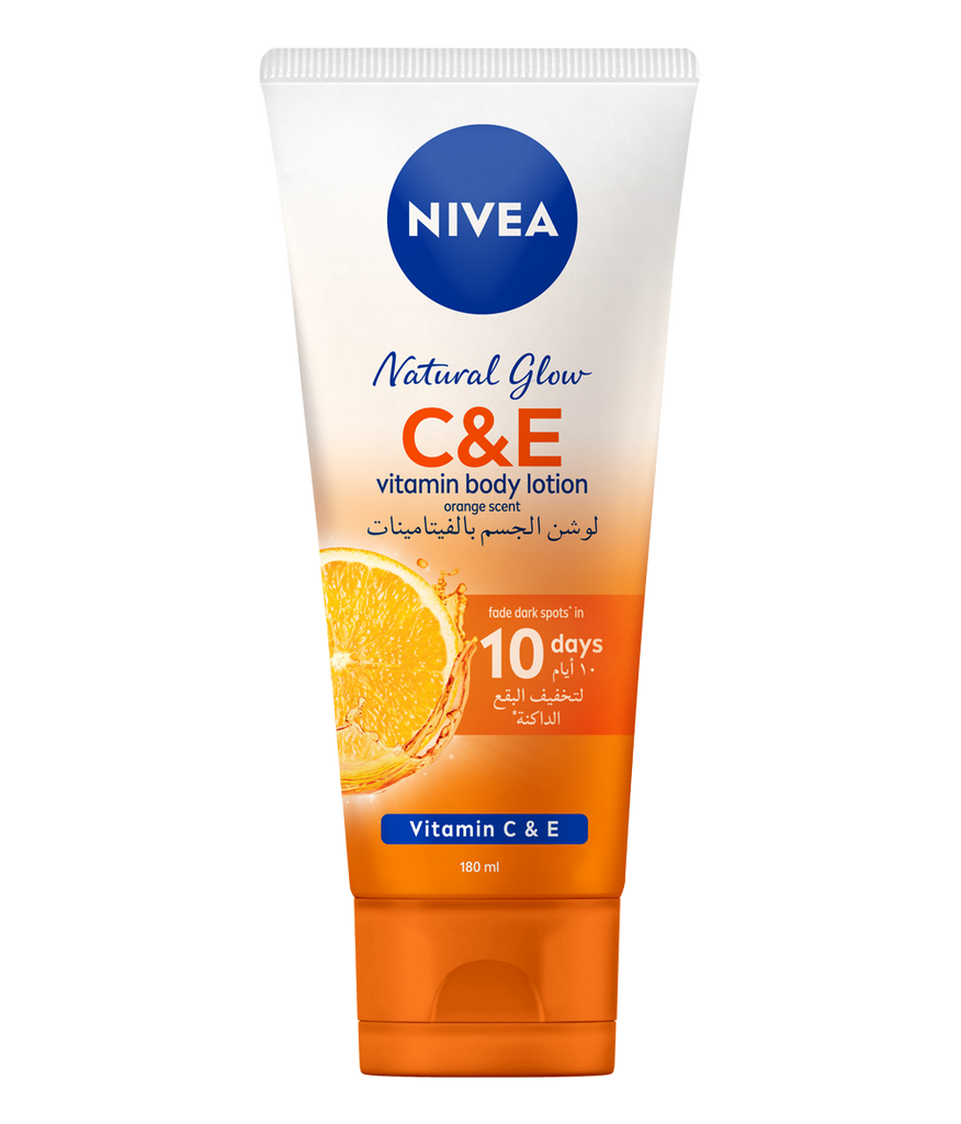 NIVEA NATURAL GLOW C&E VITAMIN BODY LOTION FOR RADIANT SKIN AND FADE DARK SPOTS Body lotion with concentrated vitamins help brighten and replenish moisture to the skin, light texture and fast absorbing.* Fade the appearance of dark spots in 10 days. For radiant skin and fade dark spots.
