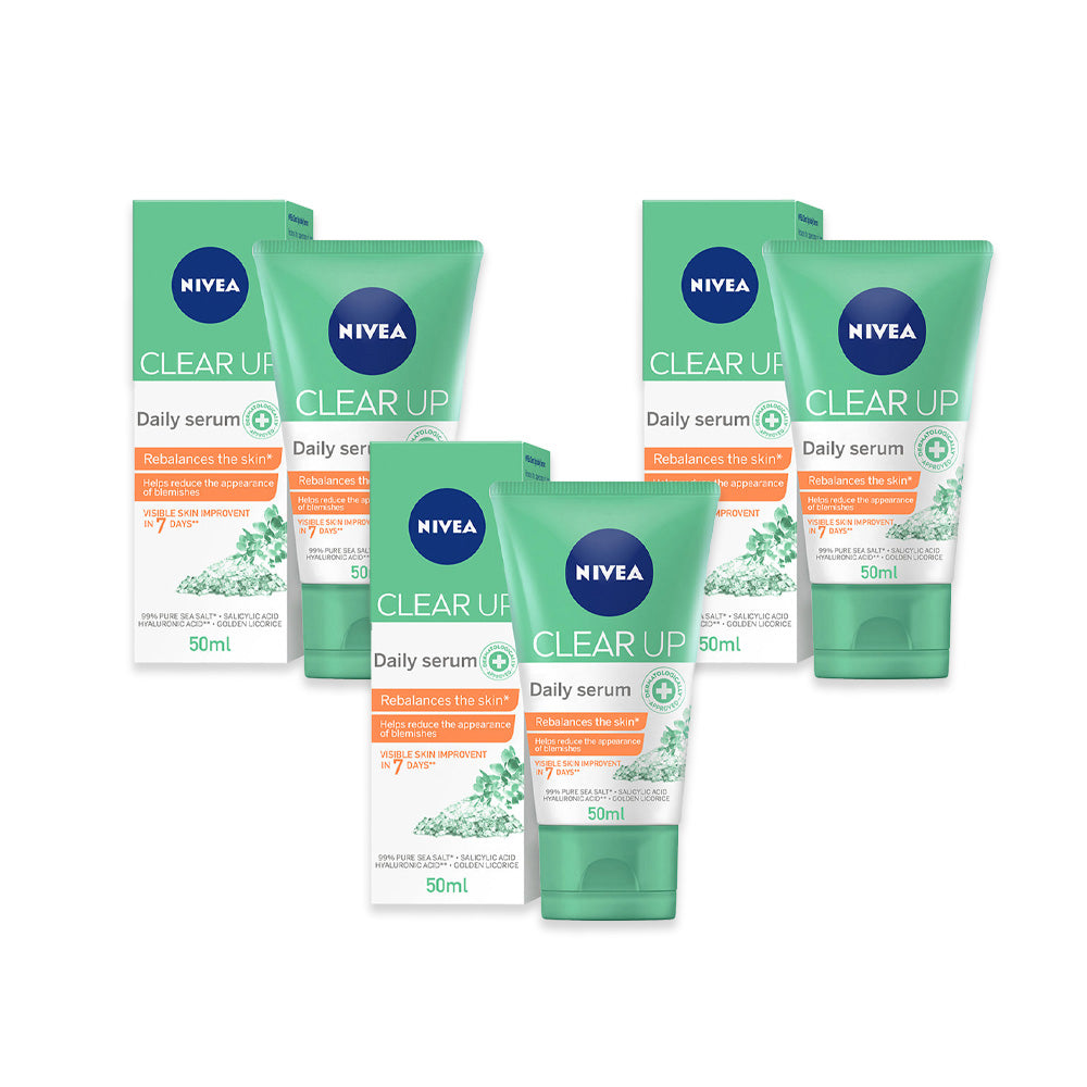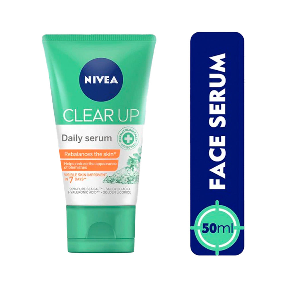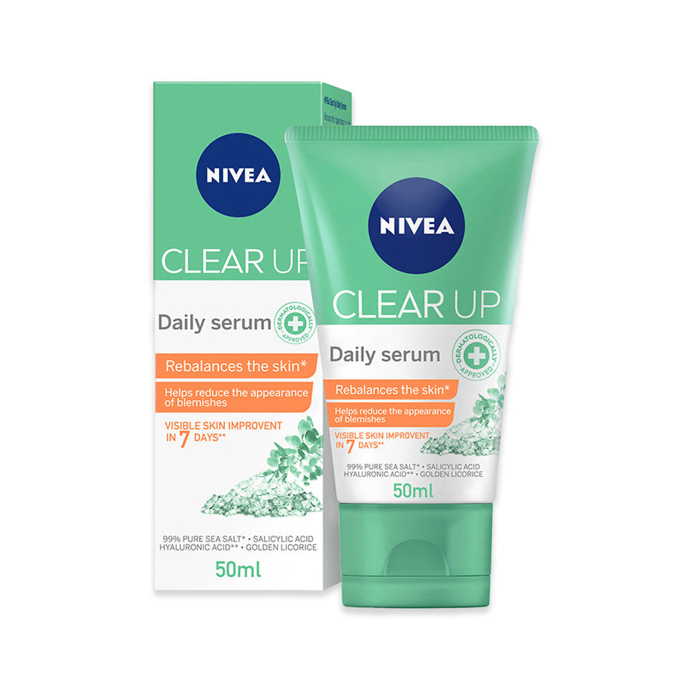 NIVEA FACE CLEAR UP DAILY SERUM Reduces the appearance of skin blemishes and provides a matte effect. *Helps improve the skin in 3 ways: 1. Absorbs oil 2. Helps soothe the skin 3. Helps improve skin hydration With the combination of powerful ingredients: 99% Pure Sea Salt (^Maris Sal), Salicylic Acid, Hyaluronic Acid (^^Sodium Hyaluronate), Carnitine & Golden Licorice