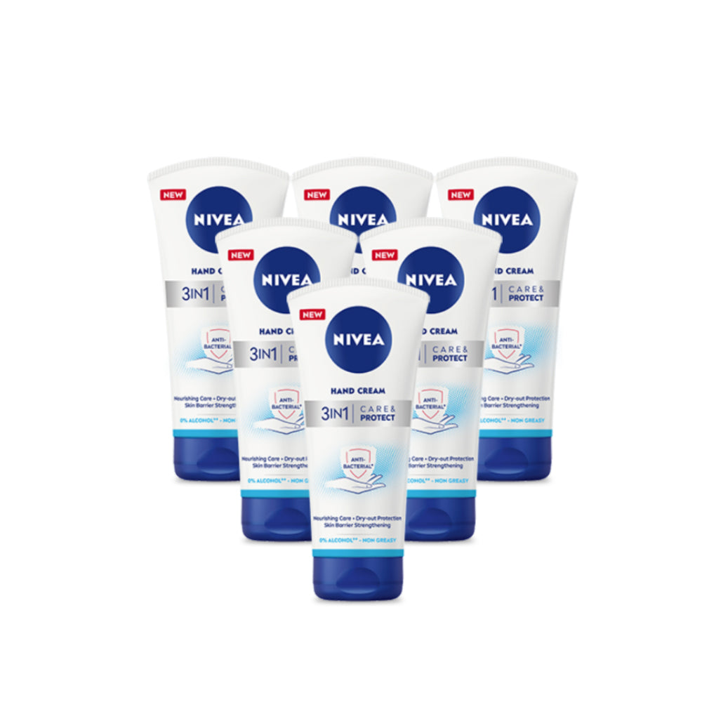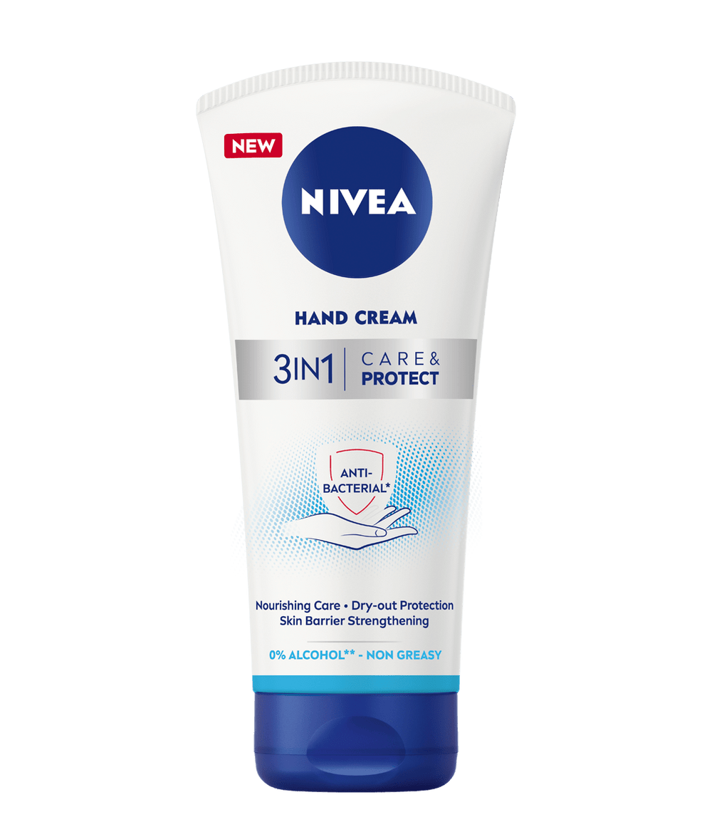 - Nivea 3 in 1 care & protect hand cream combines extra care with anti-bacterial properties to provide all-in-one care for your hands. The dermatologically tested, alcohol-free formula contains anti-bacterial properties and caring jojoba oil, so that hands are deeply nourished and the skin barrier is strengthened.
