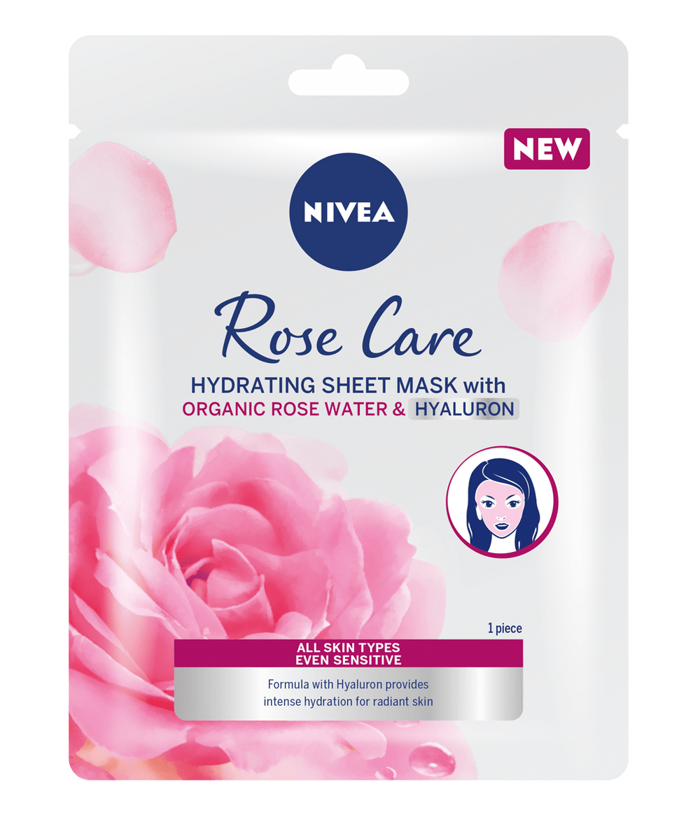 Nivea Rose Care Hydrating Sheet Mask with organic rose water and hyaluron provides intense hydration for radiant skin.