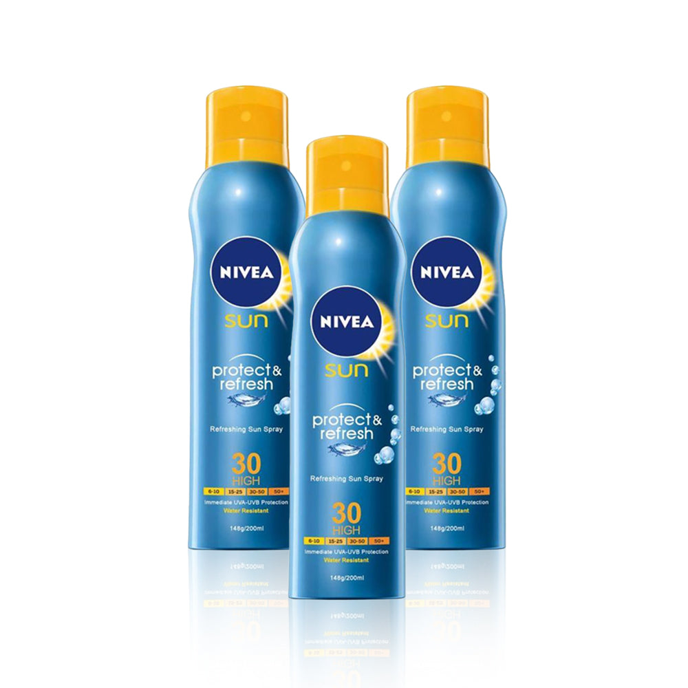 NIVEA SUN Protect & Refresh Refreshing Sun Spray provides highly effective UVA/UVB protection and has a pleasurable cooling effect that leaves your skin refreshed and silky. The 100% transparent, non-greasy spray is quickly absorbed, water resistant and leaves no white marks. Sprayable without repeated pumping from any angle it generates an easy application.