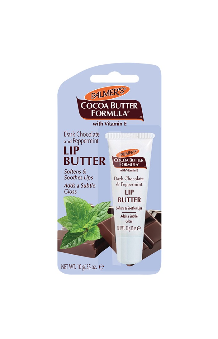 - Soften and soothe your dry, chapped lips with Palmer's Cocoa Butter Formula Dark Chocolate and Peppermint Lip Butter. Made with a special formulation of Palmer's pure Cocoa Butter, Vitamin E and Petrolatum, it provides your lips ultra-moisturization and a hint of a gloss with the delectable aroma of dark chocolate and peppermint This one-of-a-kind lip butter gives you a slight tingle so you know its working to combat even the driest of lips. The addition of Peppermint Oil freshens breath naturally.