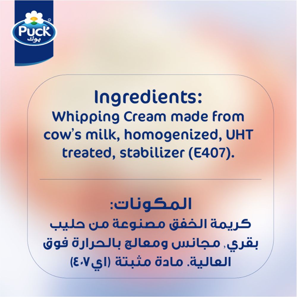 Made from high quality milk, delicate in flavor and sumptuously creamy in texture. Puck Whipping Cream will surely prove to be an invaluable asset to your most spectacular culinary creations.Puck