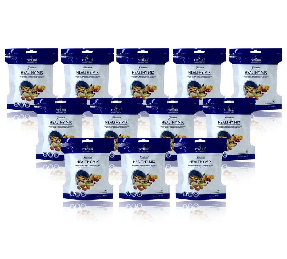 Rostaa Gourmet Being Healthy is a delicious combination of 7 power-packed Nuts & Dried Berries. The right mix of roasted nuts & luscious berries create balanced taste & even gratifying after-taste. Being Healthy is a great energy booster anytime of the day. This pack of 12 is loaded with the best grade almonds, cashews, pistachios, walnuts, figs, apricots, dried cranberries and raisins. It’s the best snacking option between meals, or can be had with a glass of milk for a quick, yet filling breakfast.