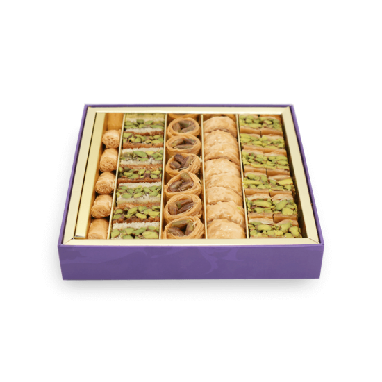 Includes pistachio baklava, roasted ballorieh, pistachio nest, cashew, and pine nut triangles.